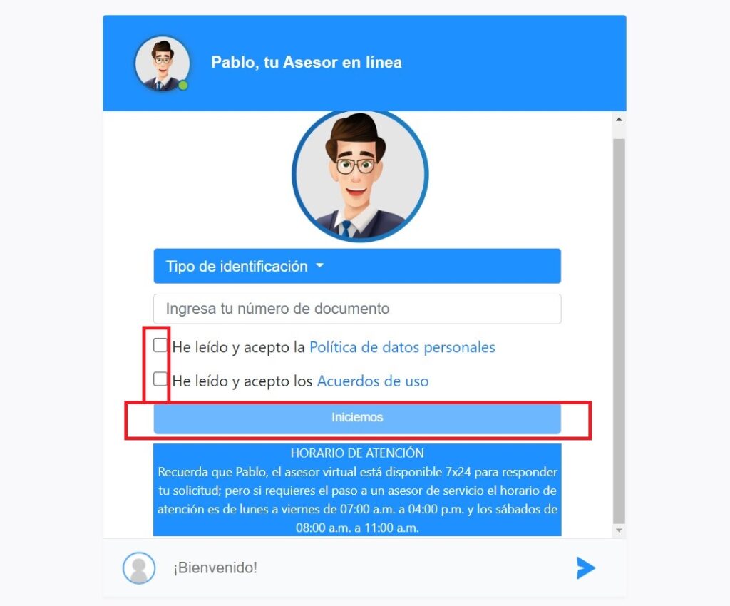 - La opción anterior habilitará la pestaña "Pablo, tu asesor en línea"; para continuar seleccione el tipo de identificación e ingrese el número correspondiente. Acepte la política de datos personales y también los acuerdos del uso, clic en "Iniciemos".