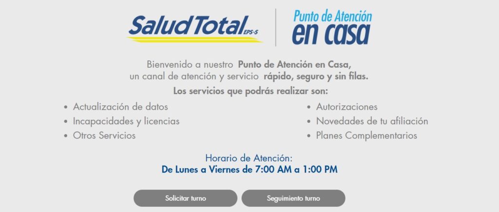 Además Salud Total EPS habilita en su plataforma el "Turno Virtual" con el cual podrá acceder al servicio "Puntos de atención en casa" un canal de atención rápido, directo y sin filas.